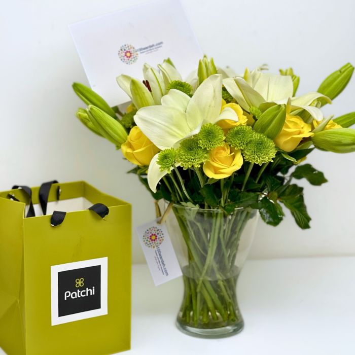 A luxurious blend of white lilies, yellow roses, and green chrysanthemums, paired perfectly with a 250gm Patchi Chocolate. Freshly delivered from Amman, Jordan for your special moments.