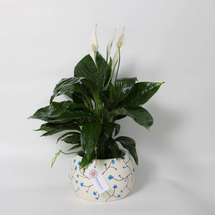 A fresh green plant presented in a beautifully crafted ceramic pot with hand-drawn shapes. Perfect for adding a touch of nature to any space or as a thoughtful housewarming gift.
