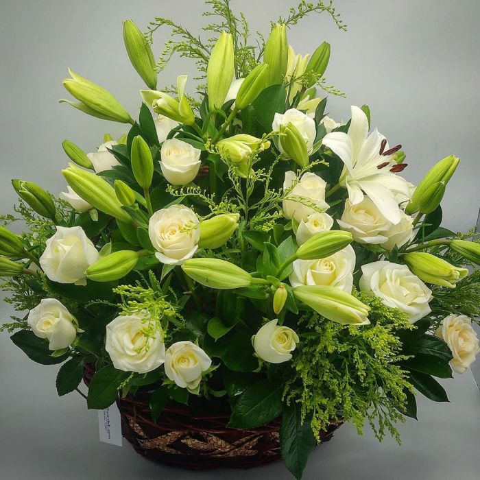 White Lillies and Roses basket!! Consisting of White Lillies and Roses. Pick how big you want your basket and add your item to the cart.